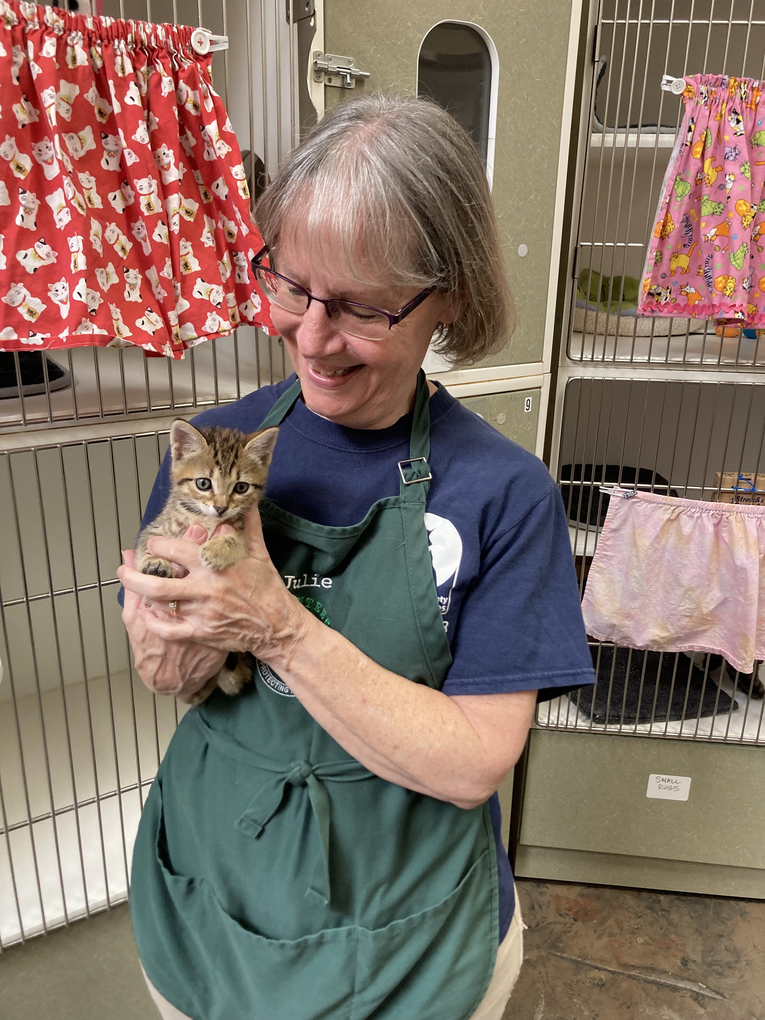 Darlene has had an affinity for animals since early childhood. She was raised on a farm and helped care for cows, pigs, chickens, dogs, cats, and her very own horse which she first received at age 5. She especially reveres cats, so after retirement from a nursing career she began volunteering in the cattery at Multnomah County Animal Services in 2012. Darlene’s participation in MCAS’s TNR program led to working in the kitten triage program and fostering feral kittens; she has continued this work, often fostering orphaned bottle babies and ill or fragile kittens.